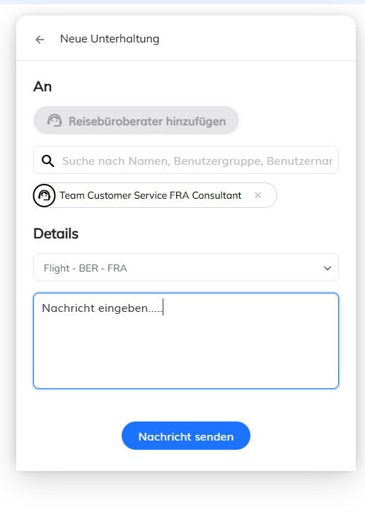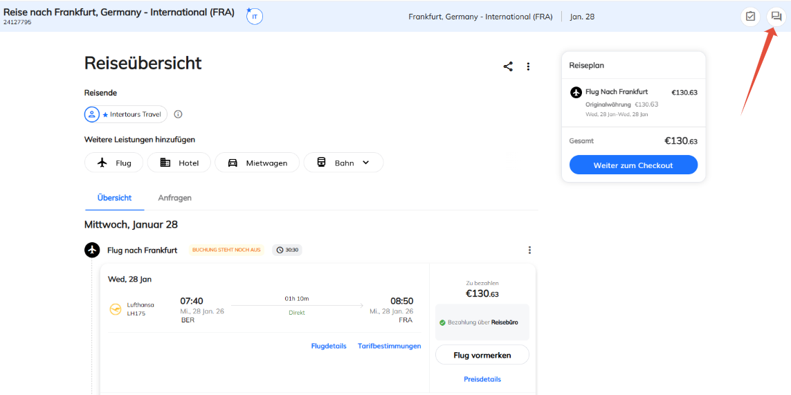Mit der Chat-Funktion können Sie schnell und unkompliziert mit dem Intertours Service Team in Kontakt treten. Ob Fragen zu Buchungen, Änderungen, Stornierungen oder allgemeine Unterstützung – unser Team steht Ihnen über den Chat direkt zur Verfügung.