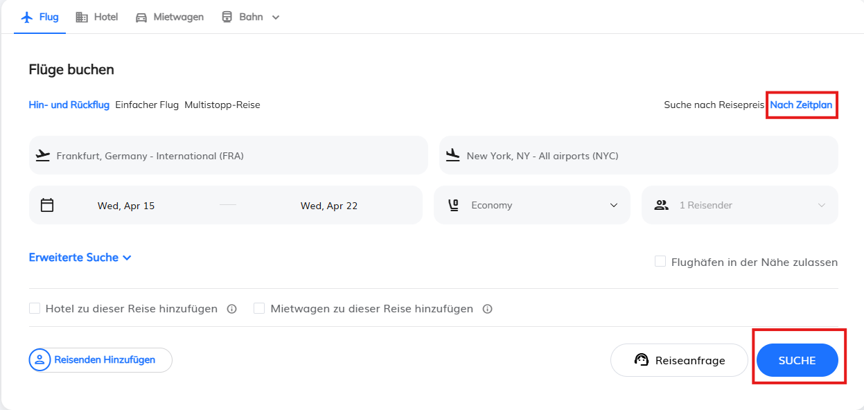 Geben Sie die gewünschten Reisedaten (z. B. Hin- und Rückflugdatum) sowie Start- und Zielort ein.
