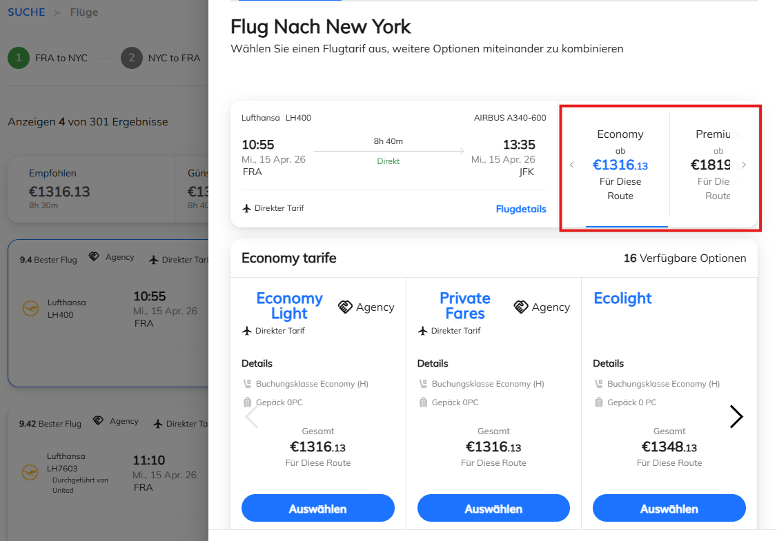 Wählen Sie den gewünschten Tarif und die Reiseklasse (z. B. Economy Class).