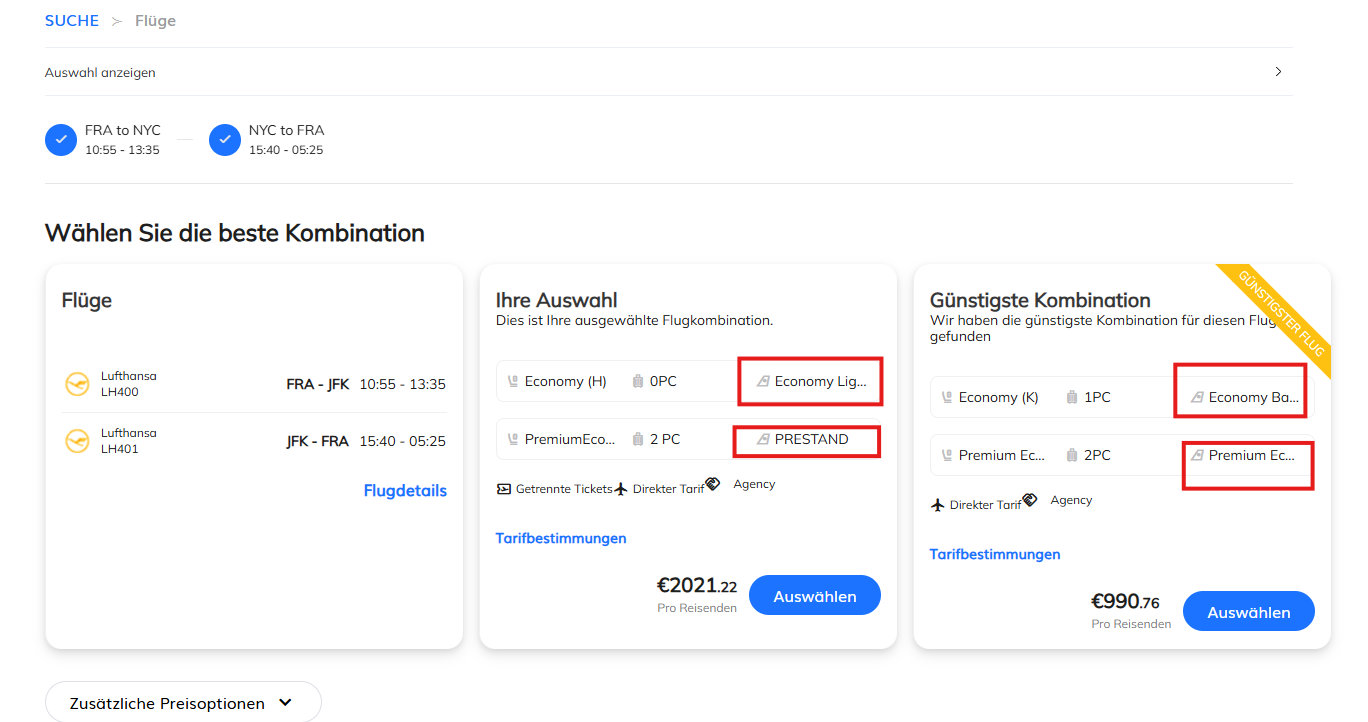Wichtig ist hierbei, dass die Suche nach Zeitplan genutzt wird und jedes Flugsegment einzeln ausgewählt wird. Erst dadurch können pro Flugsegment Tarif und Reiseklasse individuell festgelegt werden.